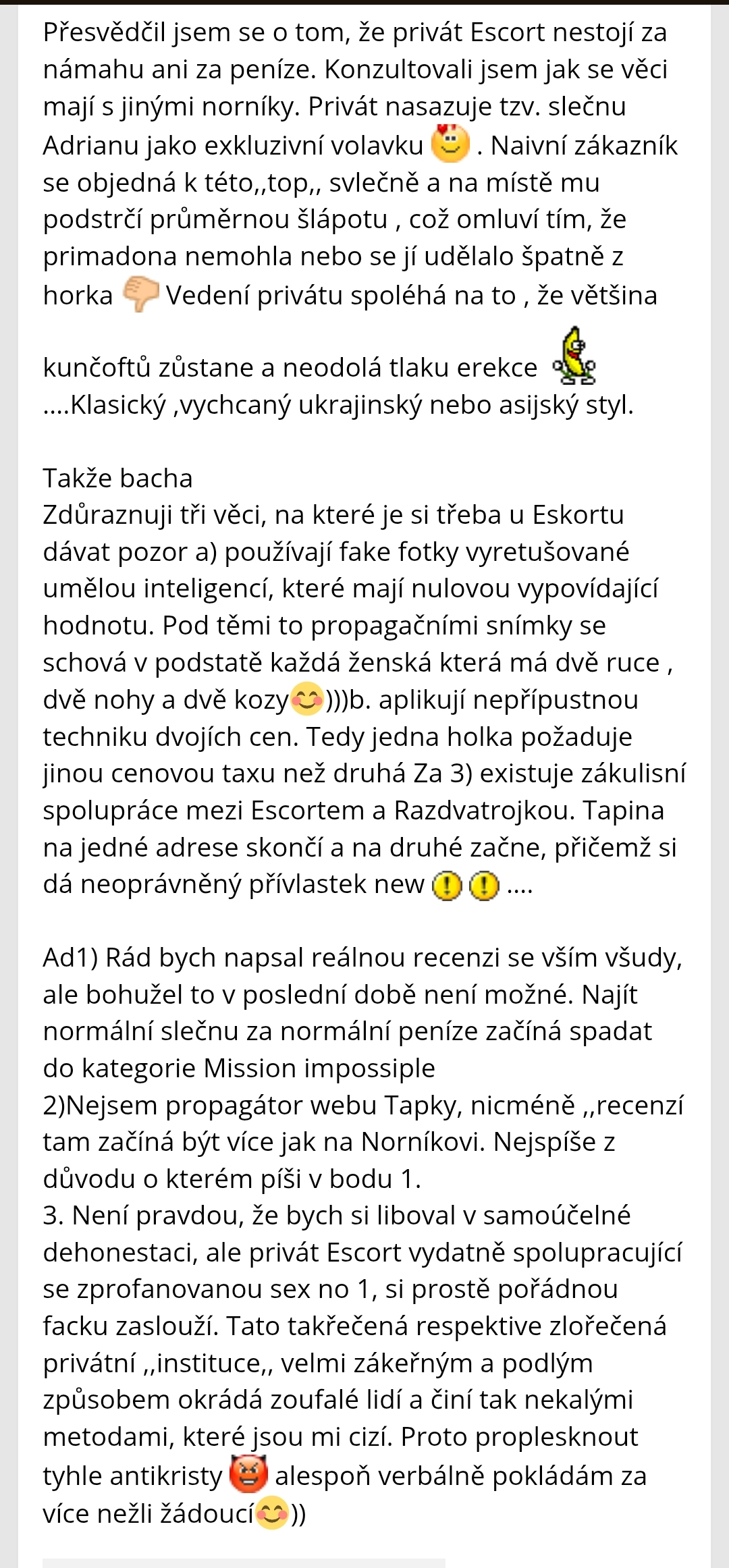 3500 Kč je sice pálka, ale já těch prachů nelituju. Adriana je fakt nádherná holka. Asi nejhezčí se kterou jsem kdy byl ever. Co je na ní trochu funny, tak mluví hrozně spisovně. Trochu na mě působí jako kdyby byla z jiný dimenze, jak vystupováním, tak i vzhledem, samozřejmě v dobrým :).